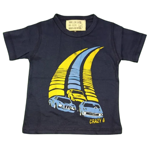Fuel your boy’s style with this navy “Crazy 8” car graphic cotton t-shirt, designed for comfort and everyday wear. Crafted from soft, breathable cotton fabric, it keeps kids cool during play, sports, or outings. The bold front print features three race cars in dynamic yellow and blue streaks, making it a fun choice for little car enthusiasts. With its short sleeves and classic crew neckline, this t-shirt offers a relaxed fit that pairs easily with shorts, jeans, or joggers. Built with durable stitching, it withstands active use and frequent washes while retaining its shape and color. Available in sizes 9M (14), 1Y (16), 2Y (18), 3Y (20), 4Y (22), and 5Y (24), this tee is perfect for boys who love speed, style, and comfort.